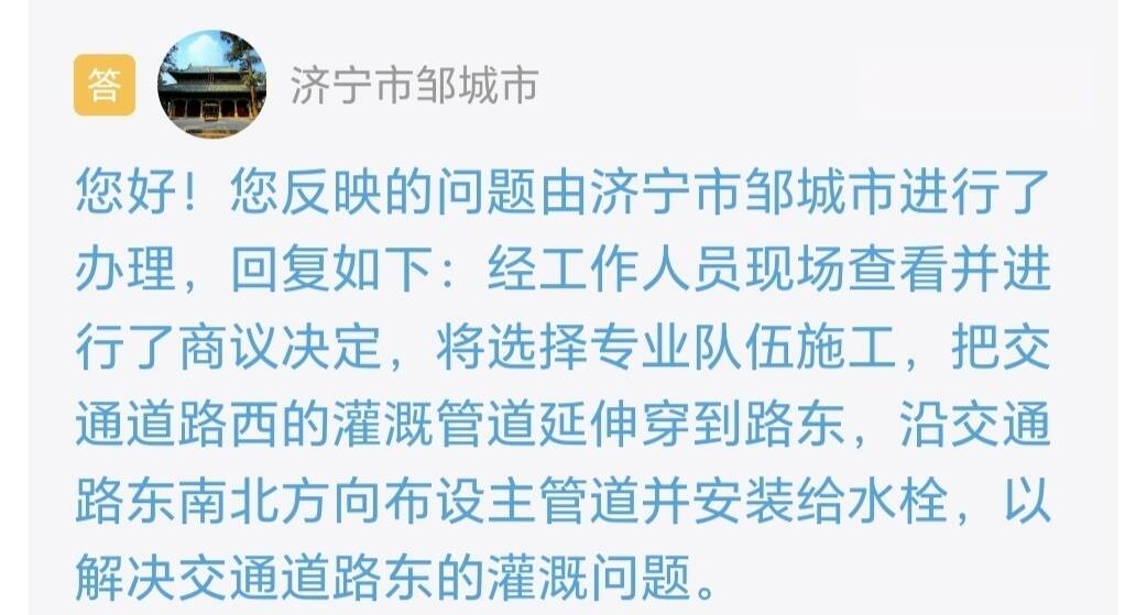收到留言后,济宁市进行了办理并回复,经工作人员现场查看并进行了商议决定,将选择专业队伍施工,把交通道路西的灌溉管道延伸穿到路东,沿交通路东南北方向布设主管道并安装给水栓,以解决交通道路东的灌溉问题。