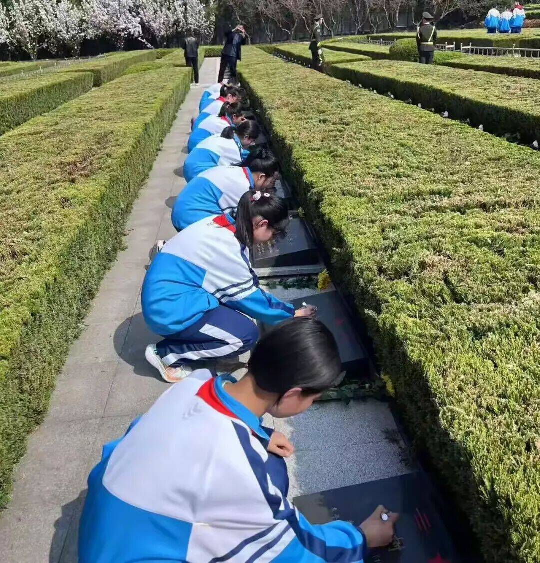 活动核心环节 —— 墓碑描金与献花致敬。工作人员提前准备好描金所需金漆、毛笔等工具,并全程指导同学们开展描金工作。“描金时要轻握笔、慢涂匀,饱含敬意,让先烈的英名熠熠生辉;献花时要轻柔庄重,把我们的思念送达到先烈身边。” 陵园工作人员细致叮嘱,为同学们讲解描金技巧、献花礼仪,以及革命先烈的英勇事迹,让红色故事在言传身教中传递。
