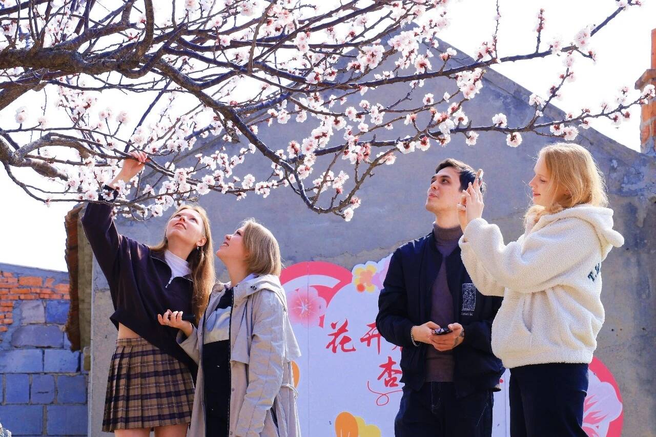 来自俄罗斯的叶卡特琳娜和朋友们在花海中拍照、参与游戏,她赞叹道:“这里有山有水有花,非常漂亮,非常喜欢!”她的朋友Yana也笑着说,穿着汉服走在杏花树下感觉特别奇妙,和大家一起玩投壶、看乐队演出,格外开心。