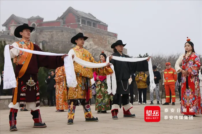 在泰山之巅,玉树州民族歌舞团为游客献上哈达。 记者 陈阳 摄