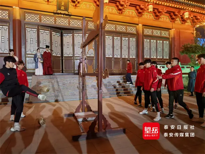 此外,永州队走进东平博物馆与大宋不夜城。队员们换上飘逸古装,摇身一变成了宋代文人雅士,穿梭在古色古香的街巷中,和NPC趣味互动、轻松打卡,在灯火璀璨间沉浸式体验宋韵风情。大家一路欢声笑语,时不时停下拍照留念,把千年宋韵的美好瞬间一一收藏。赣州队也奔赴大宋不夜城开启了一场趣味满满的宋韵文化之旅,队员们兴致盎然地观看《燕青打擂》《千里江山》等实景演出,在水浒豪情与青绿宋韵中流连忘返;走进名人堂参与《端王戏俅》情景剧互动,和NPC轻松玩闹,沉浸式感受大宋市井烟火。最让大家觉得新鲜有趣的,莫过于体验宋代蹴鞠,队员们轮番上阵、嬉笑打闹,在轻松欢乐的氛围里感受古代体育的魅力。队长卢欣表示,这次泰安之行处处充满惊喜,古朴雅致的景致、精彩好看的演出,再加上贴心周到的服务,让大家玩得特别开心,留下了十分美好的回忆。