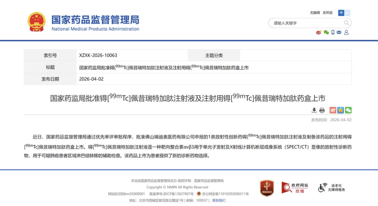 4月2日,由百洋医药集团投资孵化的核医学创新企业——佛山瑞迪奥医药有限公司(北京吉伦泰医药有限公司控股子公司)申报的“锝[99mTc]佩昔瑞特加肽注射液”通过国家药品监督管理局优先审评审批程序获批上市。这是中国首个获批上市的自主研发创新核医学放射诊断1类新药,也是国际上第一个用于SPECT显像诊断的广谱肿瘤显像药物,用于可疑肺癌患者区域淋巴结转移的辅助检查。