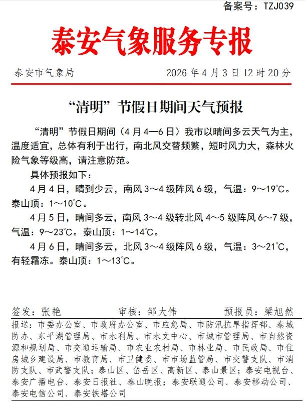 齐鲁网·闪电新闻4月3日讯 记者从泰安市气象局了解到,“清明”节假日期间(4月4—6日)泰安市以晴间多云天气为主,温度适宜,总体有利于出行,南北风交替频繁,短时风力大,森林火险气象等级高,请注意防范。