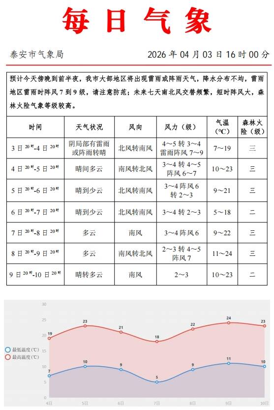 预计今天傍晚到前半夜,泰安市大部地区将出现雷雨或阵雨天气,降水分布不均,雷雨地区雷雨时阵风7到9级,请注意防范;未来七天南北风交替频繁,短时阵风大,森林火险气象等级较高。