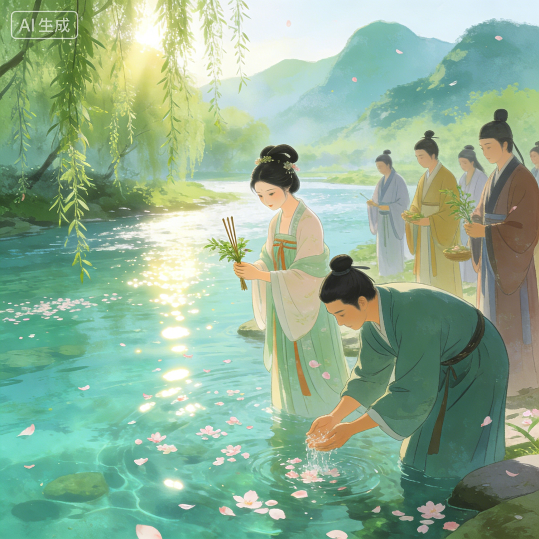 在漫长的历史流变中,清明融合了古老的上巳节。上巳节最初是农历三月第一个巳日,魏晋以后,固定为三月初三。这一节日的核心习俗是临水祓禊,人们通过洗濯身体来去除污秽、祈求吉祥,同时也会趁着春和景明踏青游春。王羲之笔下那场千古流芳的兰亭雅集,正是上巳节的祓禊活动:“是日也,天朗气清,惠风和畅。仰观宇宙之大,俯察品类之盛。”