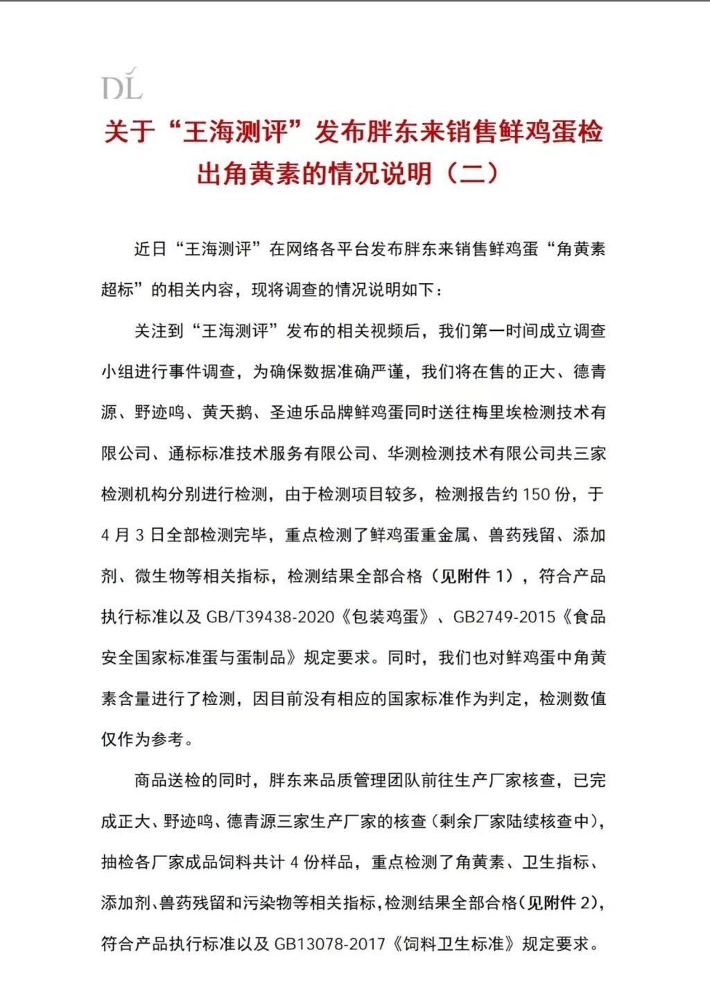 4月5日傍晚,胖东来商贸集团有限公司通过其抖音官方账号发布《关于“王海测评”发布胖东来销售鲜鸡蛋检出角黄素的详细情况说明》。