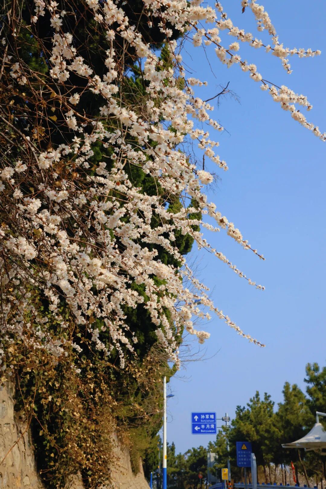 环海路沿线的连翘(4月,持续1个月左右)、十四号观景平台的丁香(4-5月)、樱花(4-5月)、海棠(4月)、环海路里窑路边蔷薇(5月)等。