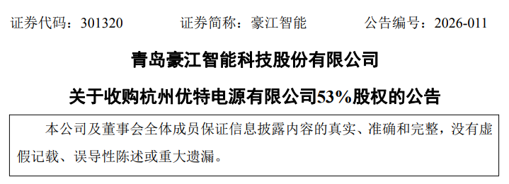 近日,青岛豪江智能科技股份有限公司发布《关于收购杭州优特电源有限公司53%股权的公告》,根据公司发展战略及业务需要,公司与优特电源股东毛昭祺、杭州优胜美电 企业管理有限公司、杭州智优明企业管理合伙企业(有限合伙)、张家港麦智电 子科技有限公司、杭州杰光科技有限公司及标的公司签署《上市公司股权收购协 议》,拟以5,936.00万元人民币暂定对价(最终转让对价=暂定对价+(过渡期净 利润×53%))现金收购前述交易各方所持有的优特电源53.00%股权。企业官网介绍:青岛豪江智能科技股份有限公司(简称豪江智能),是一家集自主研发、制造及销售于一体的国家高新技术企业,于2023年在深交所A股创业板上市,股票代码301320。豪江智能专业提供智慧家居、医养康复、智能办公、工业传动等领域的智能控制及驱动系统整体解决方案,依托多年技术积累和雄厚的研发实力,已成为国内领先、业界知名的智能控制及驱动系统整体解决方案服务商。公司拥有全球化的市场布局,已经成功开辟北美、欧洲、中东、东亚、东南亚、南美等全球近40个国家和地区的国内外知名企业建立长期合作关系。被收购方杭州优特电源有限公司官网显示,其创建于2016年,公司的核心团队是一群来自于照明和开关电源行业深耕多年的资深工程师,通过不断的研发创新,在短短几年时间里已经完成了20多项专利和知识产权的积累。公司在2017年被评为杭州市雏鹰计划企业,在2019年正式成为DIIA协会会员。综合青岛豪江智能科技股份有限公司历年年报来看,2021年营业收入约7.66亿元,归属于上市公司股东的净利润约7341万元;2022年营业收入约6.65亿元,归属于上市公司股东的净利润约6706万元;营收同比下降约13.19%,净利同比下降8.65。2023年营业收入约7.16亿元,归属于上市公司股东的净利润约4715万元。营收同比增长7.65%,净利却同比减少29.69%。2024年营业收入约8.28亿元,归属于上市公司股东的净利润约4688万元,比2023年营收增长15.74%,净利却下降0.58%。自2021年开始净利呈现了3连降,从2021年的约7341万元,下降到了2024年的约4688万元。从近期发布的2025业绩预告来看,2025年归属于上市公司股东的净利润在850万元至1200万元之间,比上年同期下降约74.4%至81.87%之间,呈现除了净利4连降的态势。在这样的情况下大手笔出资5936万元收购杭州优特电源有限公司53%股权,可见此次收购对于青岛豪江智能科技股份有限公司的重要性。公告中青岛豪江智能科技股份有限公司表示本次收购的资金来源于公司自有或自筹资金等合法资金。对于本次收购的必要性,青岛豪江智能科技股份有限公司认为:1、本次收购将有效整合标的公司优势资源,增强公司在电子类产品领域的核心竞争力收购完成后,标的公司将作为公司控股子公司纳入合并报表体系。标的公司深耕高端驱动电源领域多年,聚焦室外照明、体育照明、植物照明等高端场景,自主研发全系列高效照明驱动电源,构建了从核心电路设计、电磁兼容优化到智能制造的全链条技术壁垒。此次收购将有效整合标的公司在驱动电源领域的关键技术及核心人才资源,公司电子类产品布局将系统性拓展至高端驱动电源产品线,加速公司电子类产品驱动电源产品线更新迭代与解决方案升级,增强公司在电子 类产品领域尤其是高端驱动电源领域的核心竞争力。 2、本次收购将提升公司的资产规模及盈利能力,推动公司双轮驱动发展格局标的公司财务状况良好,具备持续盈利能力,标的公司高端驱动电源业务的 注入将推动公司收入来源的多样性,提升公司的资产规模及整体盈利能力。通过标的公司在高端驱动电源领域的核心技术、关键人才、成熟客户资源,与公司现有智能线性驱动领域技术积累形成战略互补,强化产业链协同效应,推动“驱动类产品和高端电子类产品”双轮驱动发展格局。《财经生活帮》记者 胡庆亮