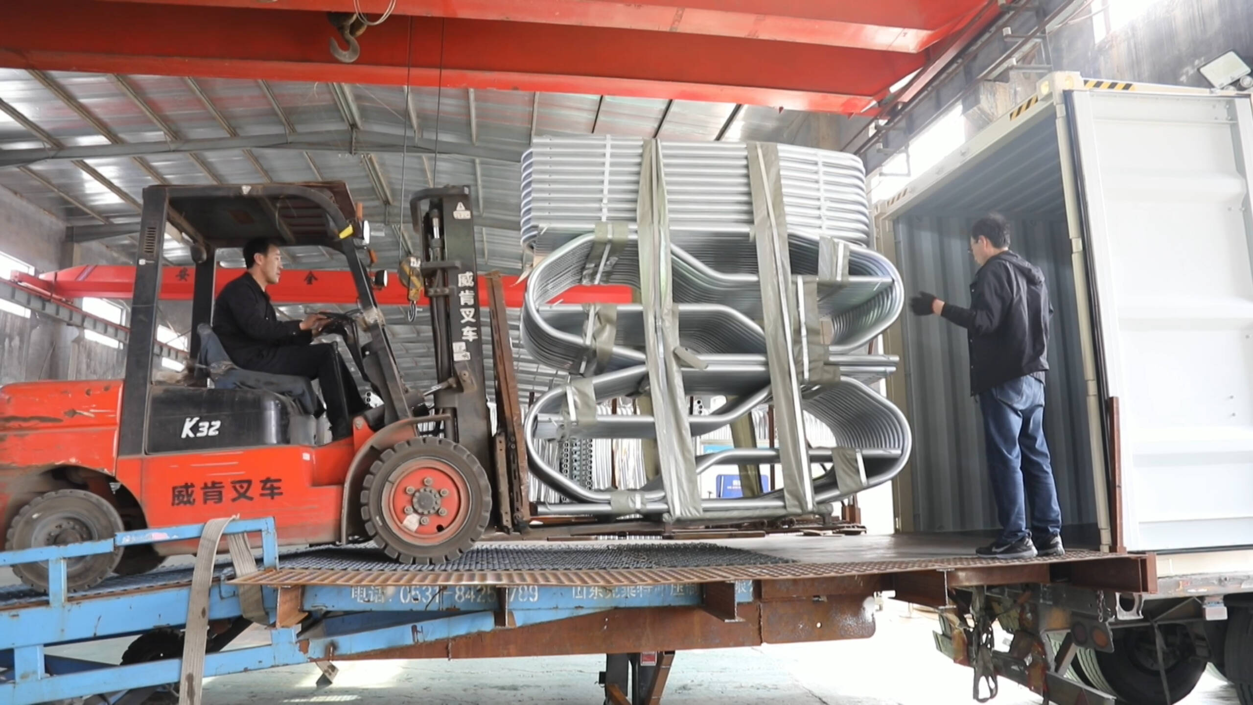 在东营东宸农牧机械有限公司的海外订单库存区,工人们正忙着对一批即将发往美国的牛栏结构件进行打包、贴标和装车。车间内机器轰鸣,叉车来回穿梭,堆码整齐的货物整装待发,即将运往大洋彼岸。