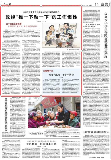 齐鲁网·闪电新闻4月8日讯 今天出版的《人民日报》在第11版“干部状态新观察·让愿担当、敢担当、善担当蔚然成风”专栏刊文《改掉“推一下动一下”的工作惯性》,点赞山东枣庄市提升干部参与招商引资的积极性。