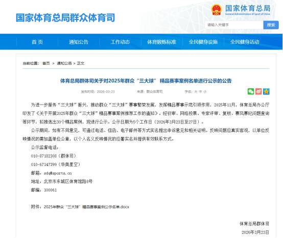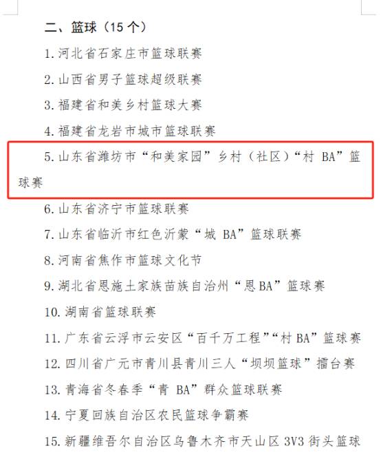 齐鲁网·闪电新闻4月8日讯 近日,国家体育总局公布2025年度全国群众“三大球”精品赛事案例名单,由中共潍坊市委宣传部、潍坊市体育局、潍坊市农业农村局、潍坊市商务局、潍坊市文化和旅游局、潍坊市体育总会共同主办的“和美家园”乡村(社区)“村BA”篮球赛成功入选。这一荣誉标志着潍坊市在探索基层体育赋能乡村振兴、推动全民健身与精神文明建设深度融合方面,走在了全国前列。
