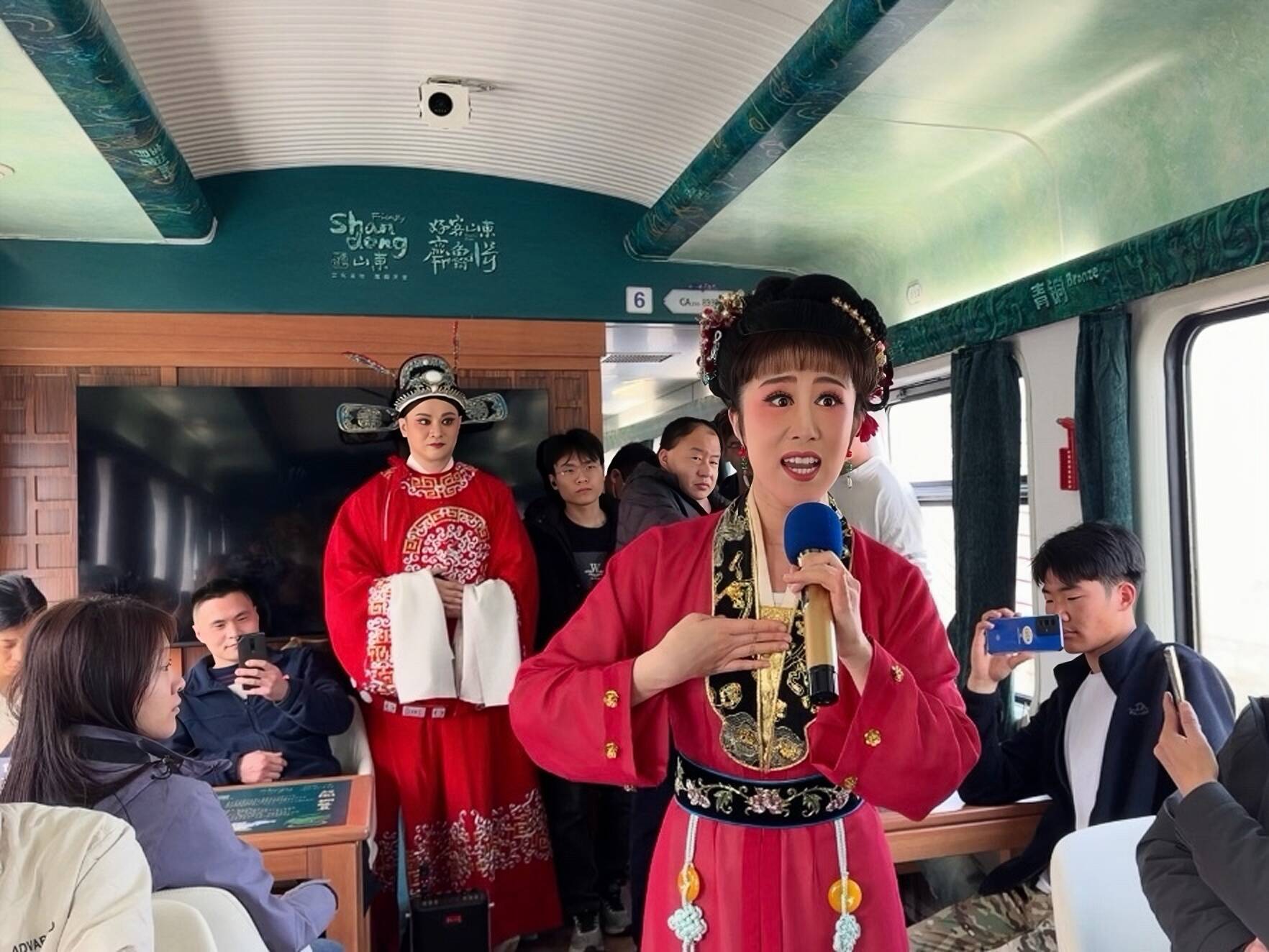齐鲁网·闪电新闻3月23日讯 (山东台综合广播)3月22日上午,伴随着车轮与铁轨的轻快律动,一场别开生面的吕剧“快闪”在“好客山东·齐鲁1号”文物研学主题旅游列车上惊喜上演。来自山东省吕剧院的青年演员任婧、陈明,以车厢为舞台,为旅客带来了一场原汁原味的家乡戏盛宴。