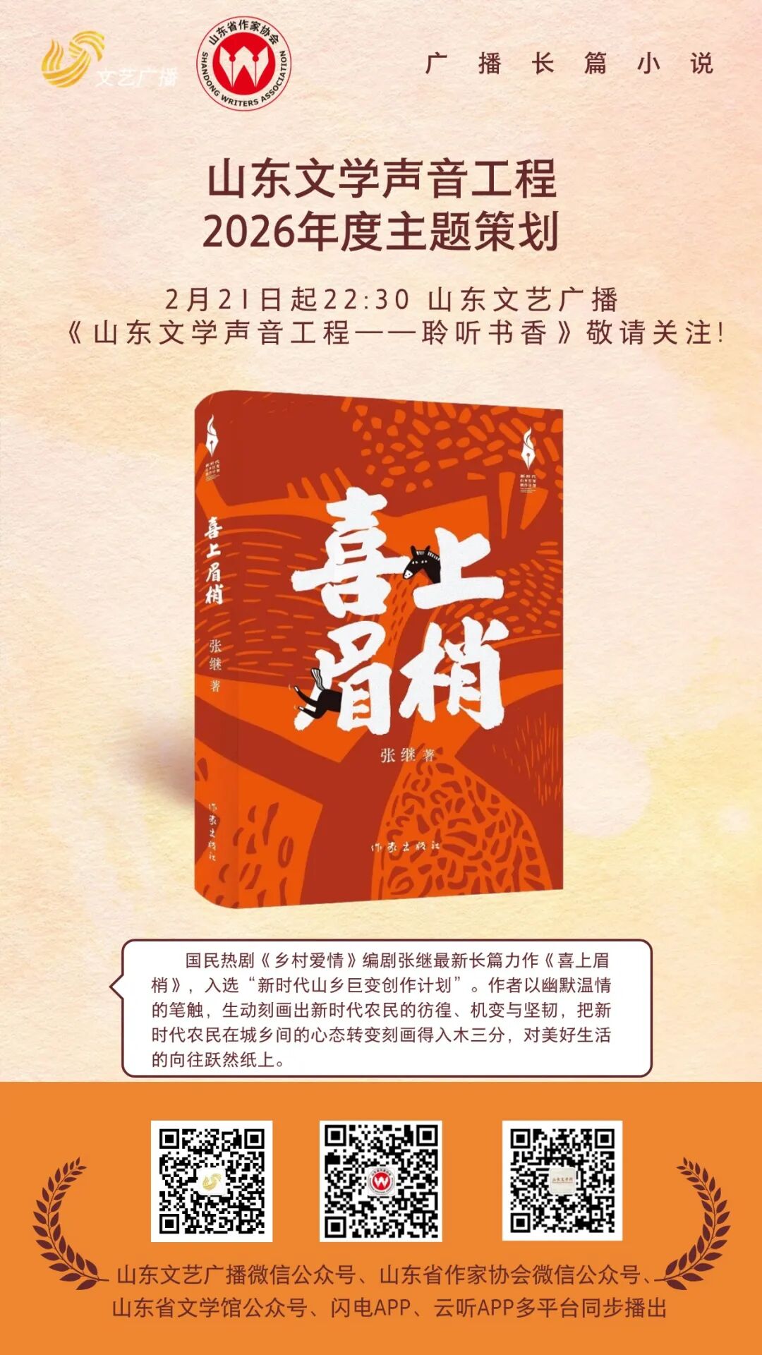 山东文学声音工程2026年度主题策划★ 广播长篇小说 ★《喜上眉梢》国民热剧《乡村爱情》编剧张继最新长篇力作《喜上眉梢》节选:镇上的侯书记也看到了小桥村上了热搜,他没有亲自来,但是安排明主任来了,让他给何大炮说要抓住这个机会,把小桥村和小桥村的驴给宣传出去,多搞一些与驴相关的内容,如果看驴的人来了,没有看头,等热点过去了,就凉了……-END-来源:山东文艺广播编辑:杨慧责编:郭荣杉监制:孙彦杰
