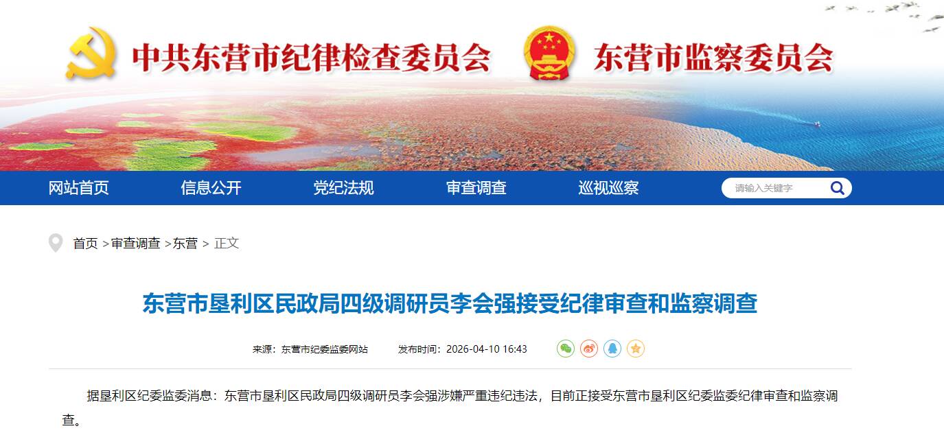 齐鲁网·闪电新闻4月10日讯 据东营市垦利区纪委监委消息:东营市垦利区民政局四级调研员李会强涉嫌严重违纪违法,目前正接受东营市垦利区纪委监委纪律审查和监察调查。