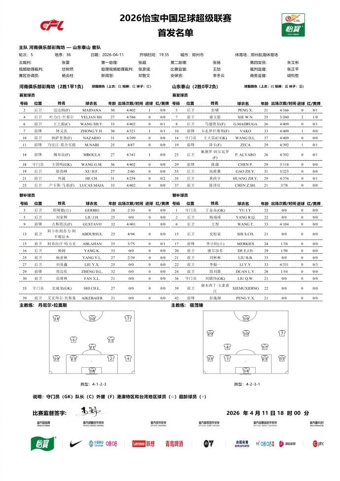 闪电体育4月11日讯 今晚19:35,中超第5轮,河南vs山东泰山。赛前首发阵容已经公布。