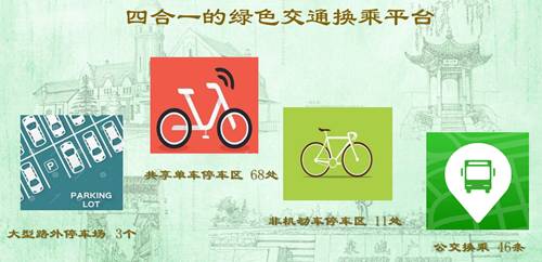 以上范围内,为了方便人们的生活,也投放了共享单车。共施划共享单车停放点68处,保障区域内方圆1公里内共享单车点位不低于10处。