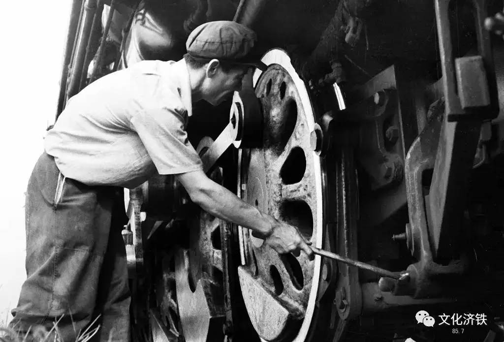上世纪八十年代中期,在潍坊站检查蒸汽机车的火车司机。