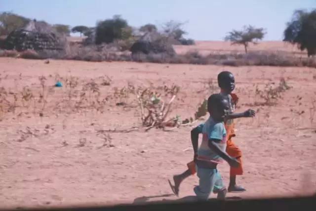 在一路的警觉中,我们穿越了数个满是茅草屋的贫穷村落,在沙尘蔽日的道路上一路颠簸,扬起的沙尘乌泱泱地压向两旁的驴车马车。一眼望去,这片原本富饶的土地在经过战乱的百般摧残后,除了黄沙漫漫,就是贫穷和落后。每当我们的车队停下来休整,就会从灌木丛里钻出来当地的孩童,一边向我们招着手,一边高声喊着“salin,salin”,然后指指自己的嘴,向我们索要食物。我们甚至看到一个才六七岁的小男孩,背着一个更小的孩子,追逐着车队。