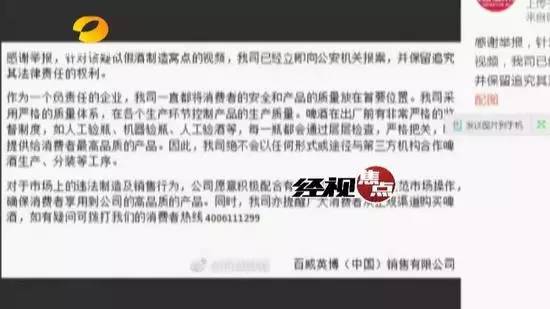 面对众多网友的质疑,百威公司也通过官方途径发布公告说明称,网络视频片段来自假酒工厂,目前公司已经报警。百威称重视消费者安全和产品品质,并有多重把关,也不会将产品交予第三方生产生产、分装。