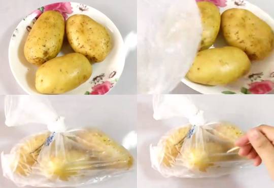 第一步: 将洗净的土豆装进保鲜袋中,扎紧袋子,用牙签在袋上戳几个小孔。