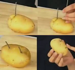 第一步: 拿两三根干净的铁钉,将钉子钉在土豆上,一定要穿透土豆,没有金属钉,用金属筷子也不错。