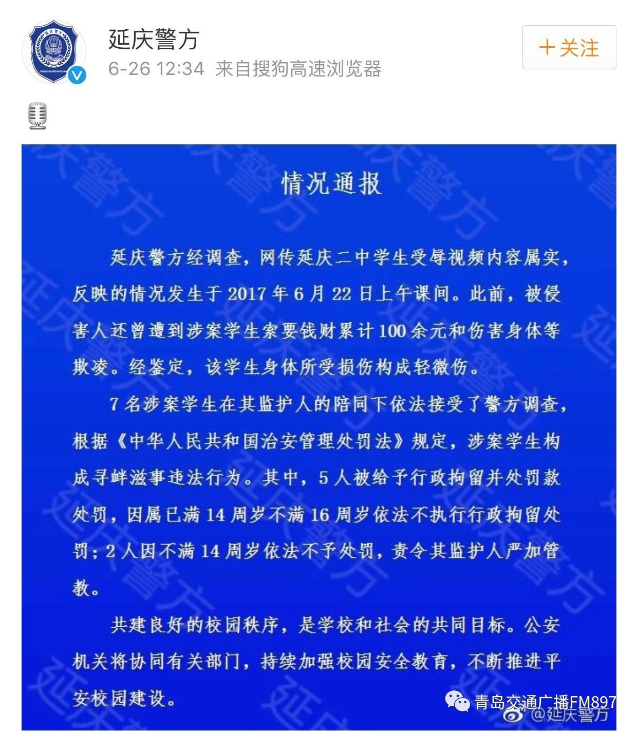 今天中午12点34分,延庆警方通报初中生"被逼吃粪"事件, 7名学生接受调查5人被行拘。