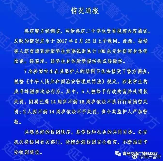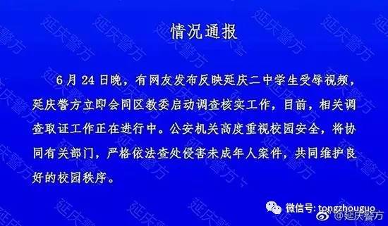 延庆警方昨天下午6点11分通报称,24日晚有网友发布反应延庆二中学生受辱视频,延庆警方立即会同区教委启动调查核实工作。目前,相关调查取证工作正在进行中,公安机关高度重视校园安全,将协同有关部门,严格依法查处侵害未成年人案件,共同维护良好的校园秩序。