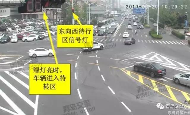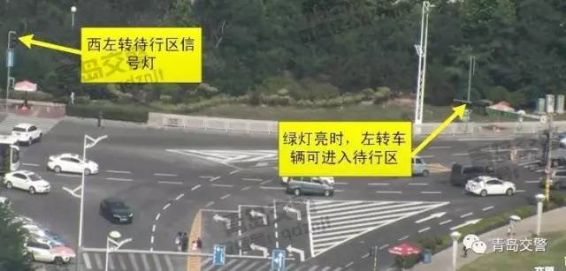 ❷当西向东信号灯绿灯启亮时,左转车辆驶入待转区;当西左转待转区信号灯绿灯启亮时,左转车辆驶离待转区。