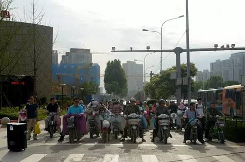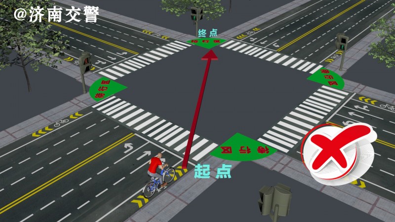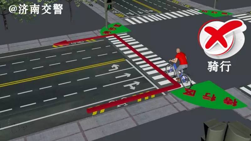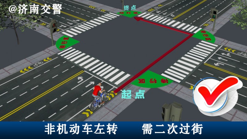 非机动车需要左转通过路口时,应按照逆时针方向二次过街。即首先按照顺向非机动车信号灯指示前行至前方待行区,再按照垂直方向非机动车信号灯指示通过路口。红灯时,需在待行区域内等候通行;绿灯时,快速通行。