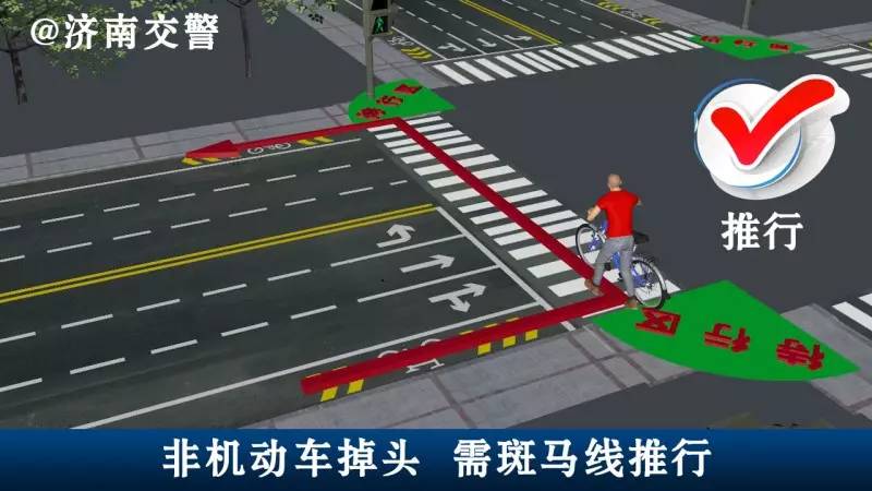 非机动车需要到路口掉头行驶时,应在确保安全的前提下,沿就近的人行横道下车推行通过路口。在人行横道上推行非机动车时应靠右侧通行。