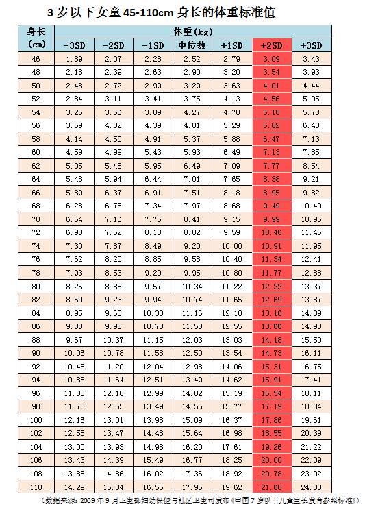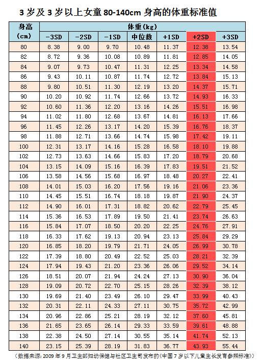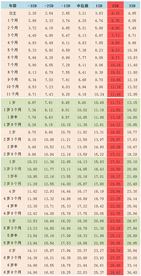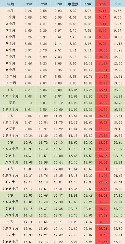 也就是说,如果你家孩子的体重,超出这几个表格中标注成红色的“2SD”这一列的数值,那就有些超重了。