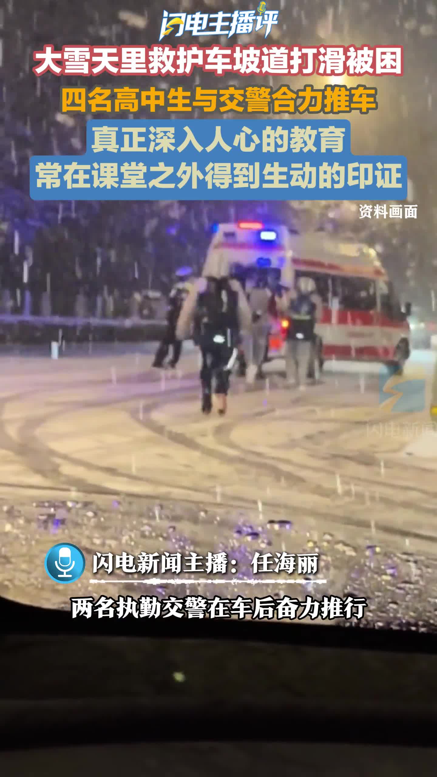 闪电主播评丨大雪天里救护车被困陡坡 4名学生冲出与交警合力推车