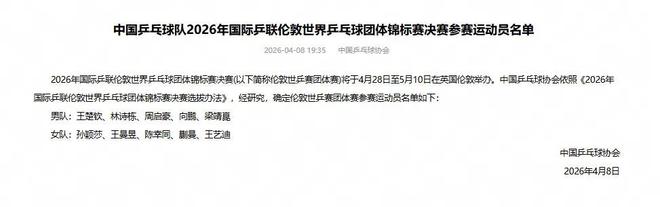 国乒公布世乒赛名单:孙颖莎王楚钦领衔 樊振东自愿放弃
