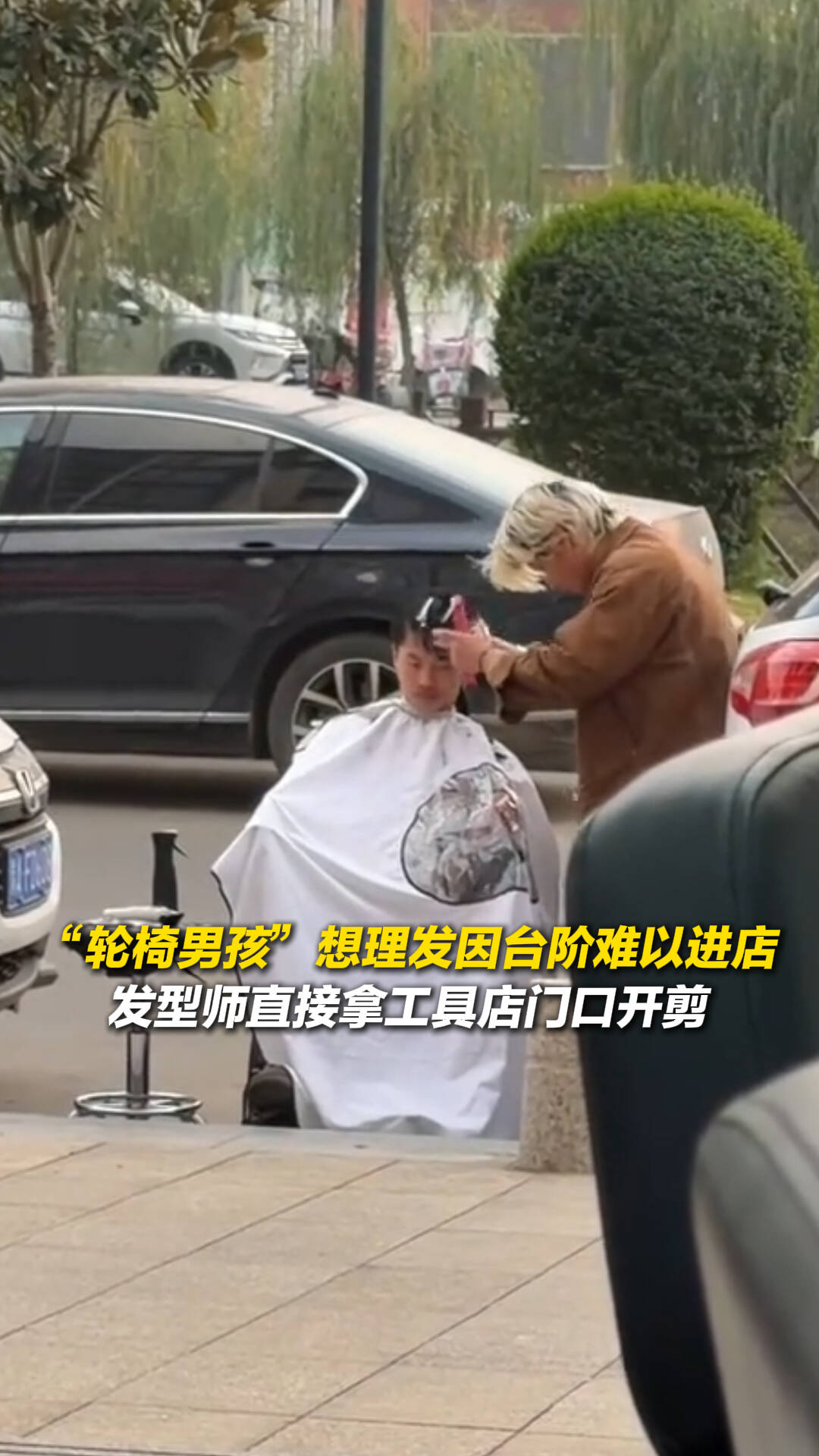“轮椅男孩”想理发因台阶难以进店 发型师直接拿工具店门口开剪
