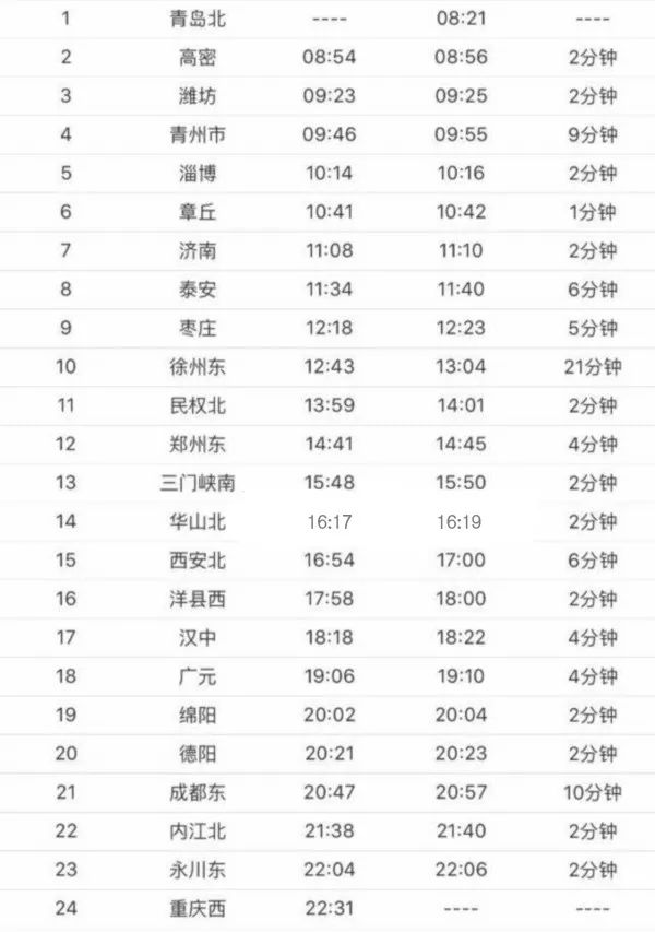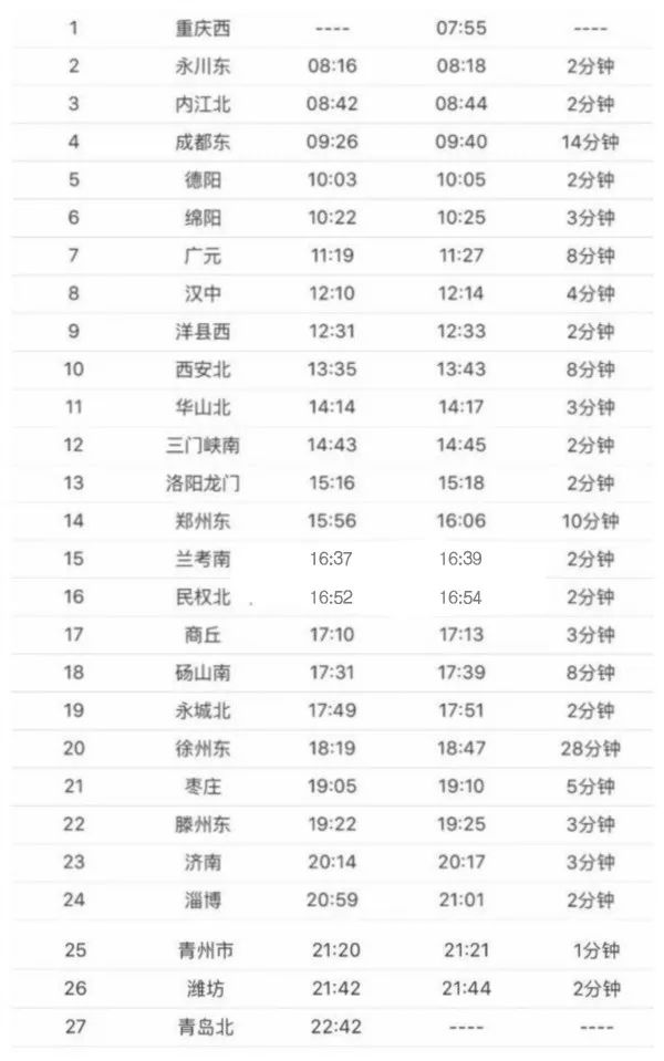 回程的G1836次重庆西站开车时间为7:55,当天22:42到达青岛北站,全程共运行14小时47分。