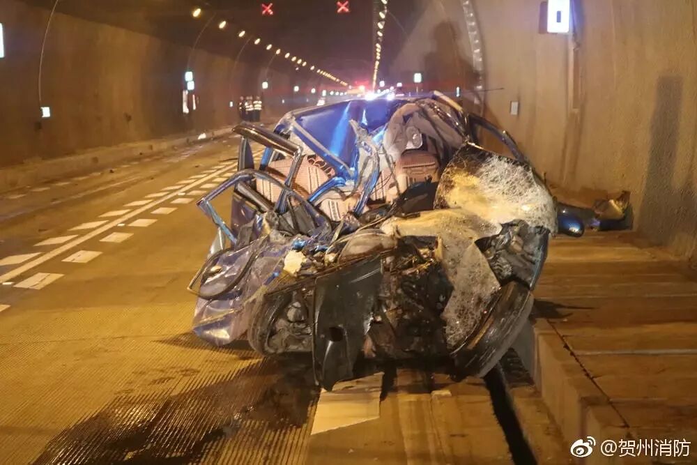 2018年8月21日,汕昆高速贺州段,一辆蓝色小车从贺州往桂林方向逆向行驶至木冲隧道内,与白色小车发生对撞后,又与一辆半挂车发生碰撞,该事故造成,蓝色小车驾驶员死亡。