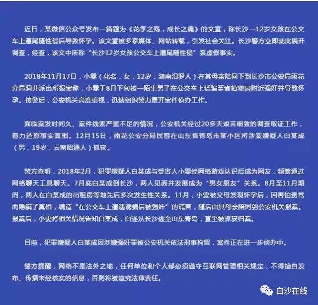 近日,某微信公众号发布一篇题为《花季之殇,成长之痛》的文章,称长沙一12岁女孩在公交车上遭尾随性侵后导致怀孕。该文章被多家媒体、网站转载,引发社会关注。长沙警方立即就此展开调查,经查,该文中所称"长沙12岁女孩公交车上遭尾随性侵"系虚假事实。