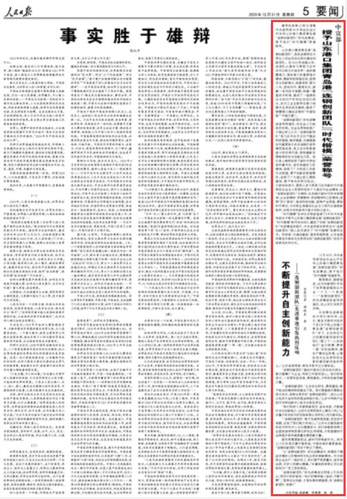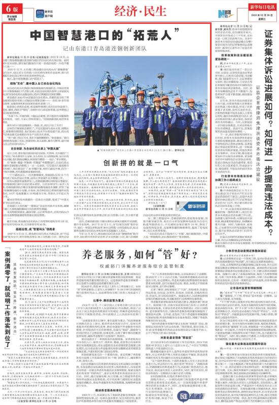 12月30日,本报报道了山东港口青岛港“连钢创新团队”的自主创新故事,他们面对全球工业4.0给港口发展带来的机遇与挑战,以科技报国的家国情怀,从一张白纸起步,经历十几万次的流程测试,终于建成了全球领先的全自动化集装箱码头,实现了从跟跑欧美到领跑世界的蝶变。报道刊发后,在全社会特别是制造行业引发了广泛关注和热烈讨论。