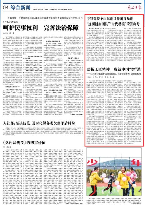 12月30日,中央宣传部向全社会公开发布山东港口集团青岛港“连钢创新团队”的先进事迹,授予他们“时代楷模”荣誉称号。敢闯敢试、砥砺奋进,这支创新团队书写了世界集装箱码头行业一个又一个奇迹……“连钢创新团队”的先进事迹经宣传报道后,引发热烈反响。今天出版的新华每日电讯、人民日报、光明日报等央媒再次点赞“连钢创新团队”先进事迹。报道如下:
