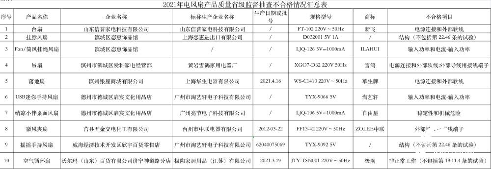 抽查发现山东信普家电科技有限公司生产的1批次和滨城区恋惠饰品馆、滨州市滨城区爱科家电经营部、滨州银座商城有限公司、德州市德城区启宸文化用品店、莒县五金交电化工有限公司、威海经济技术开发区欣宇百货零售店、沃尔玛(山东)百货有限公司济宁神道路分店7家销售者的9批次产品不符合相关标准的要求,不合格项目为稳定性和机械危险、非正常工作、外部导线用接线端子等。