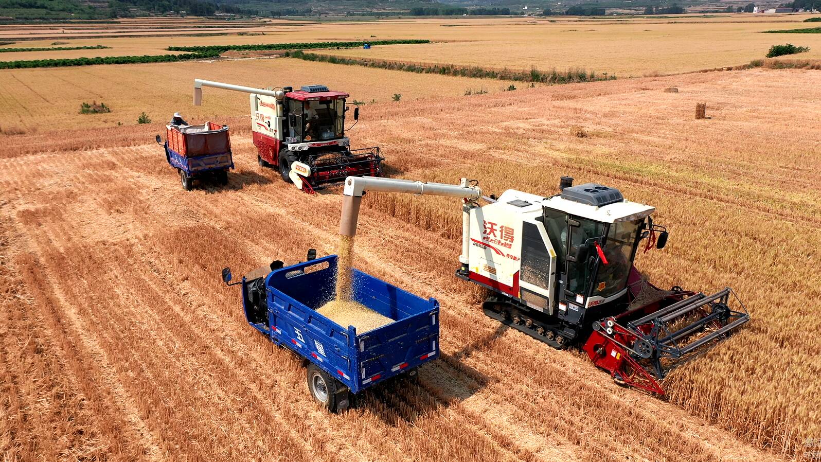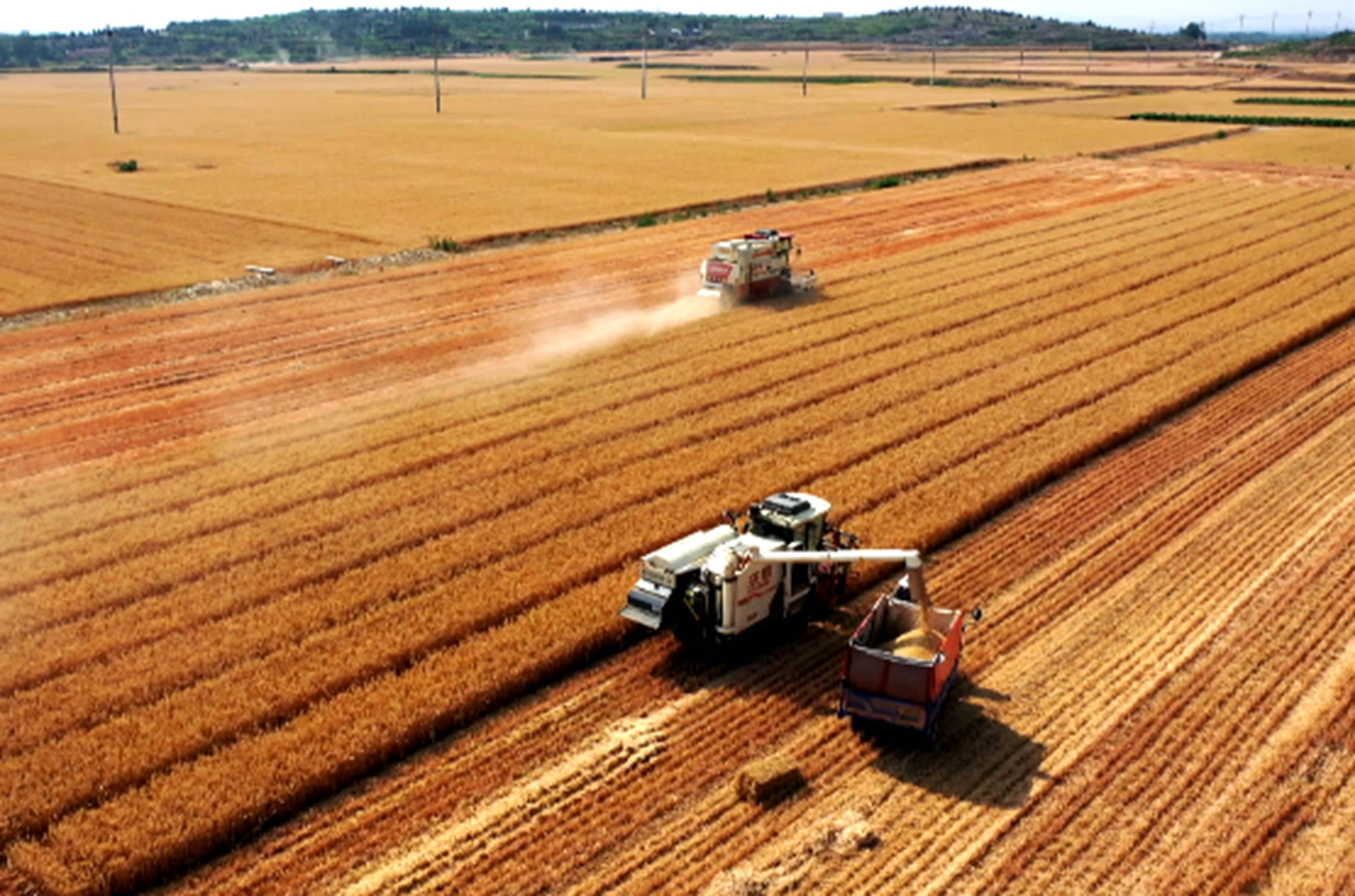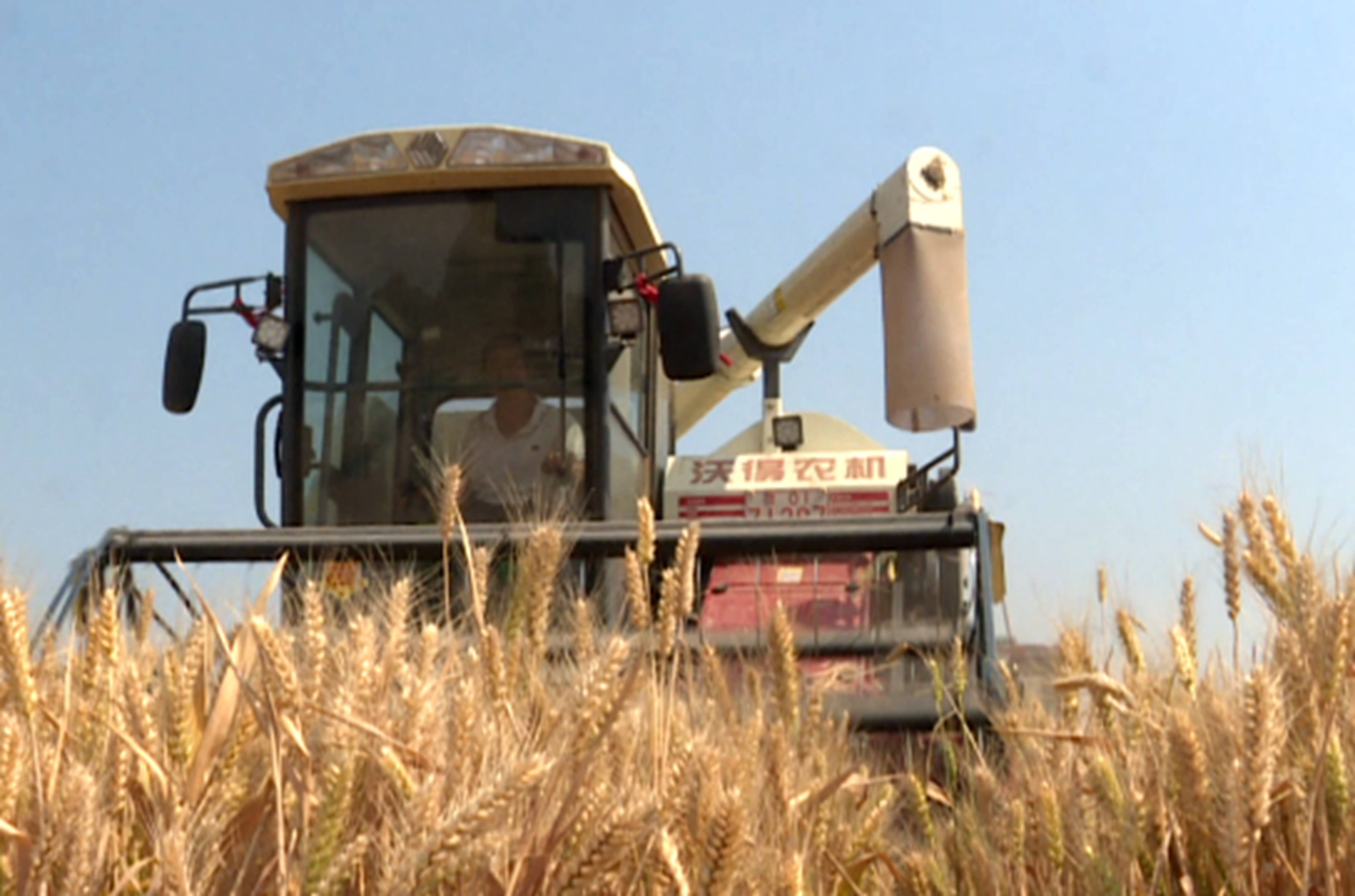 记者在孝直镇看到,一株株饱满的麦穗随风摇摆,一台台联合收割机正在田里收割小麦。农场负责人告诉记者,由于今年气候条件再加上科学选种、合理种植,小麦丰收已成定局。