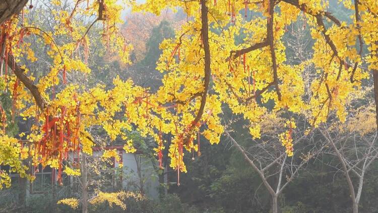 金秋时节,走进白马山,来到白马寺,立时被高大的“银杏王”所吸引。只见茂密的大树上,满身挂满了金色的果实,一嘟噜一串串,让人目不暇接。历经三千年风雨洗礼,银杏树依然郁郁苍苍,焕发出顽强的生命力,令人惊叹不已。