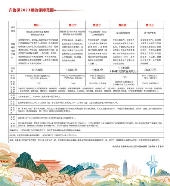 目前,济南市已建立起以基本医保为主体,大病保险、长期护理保险为补充,困难群众医疗救助为托底的全覆盖的医疗保障制度体系。齐鲁保2023版由山东省医保局、济南市医保局指导,国家金融监督管理局山东监管局监管,梯次减轻重特大疾病患者的就医负担,已成为济南市基本医保的重要补充。