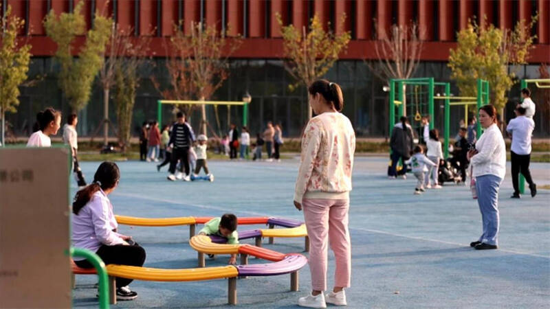 向西穿过公园广场,来到了海蓝色塑胶儿童运动场地,这里为孩子们布置了多种活动设施,秋千、攀爬设施、沙坑等一应俱全,是孩子们的乐园。