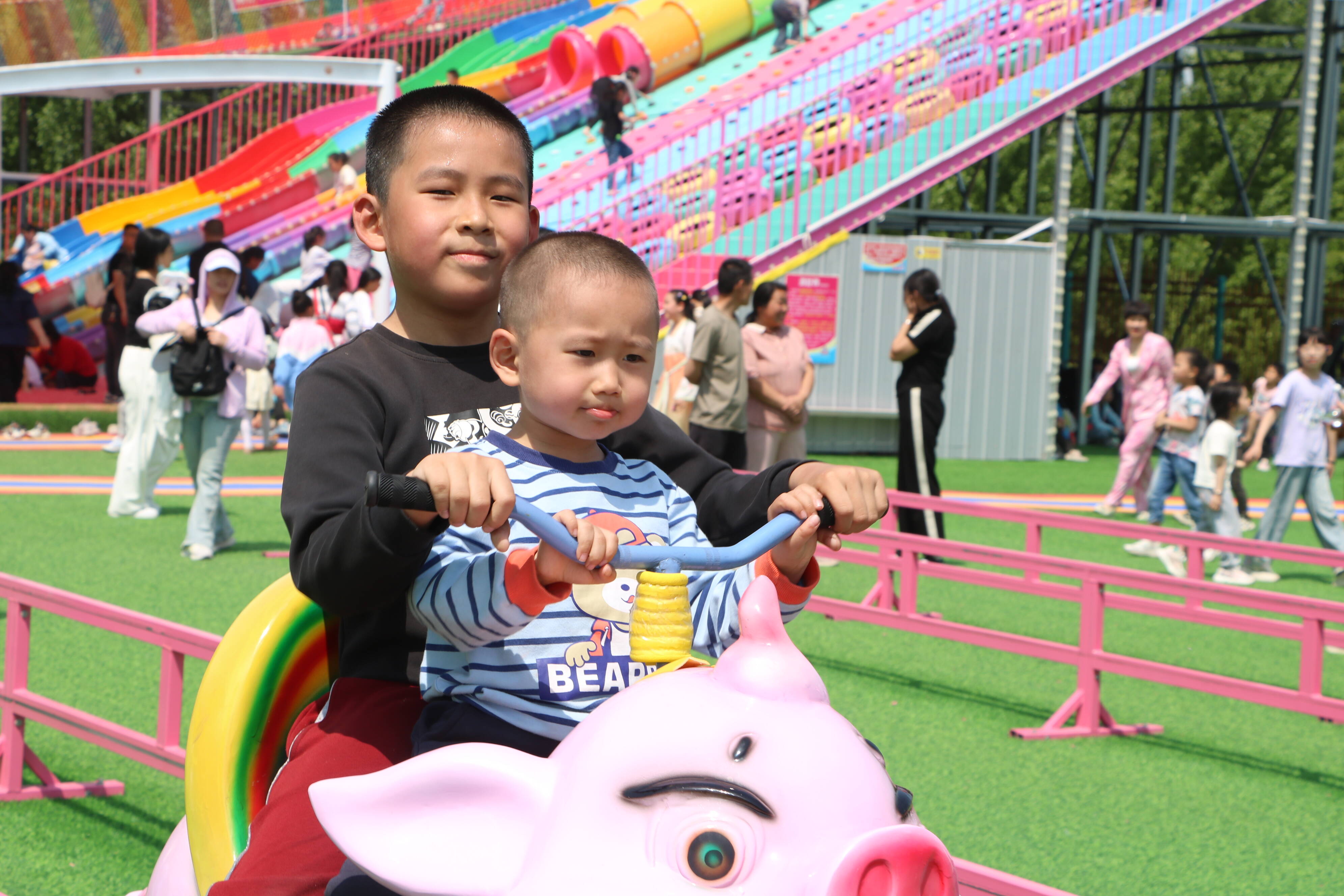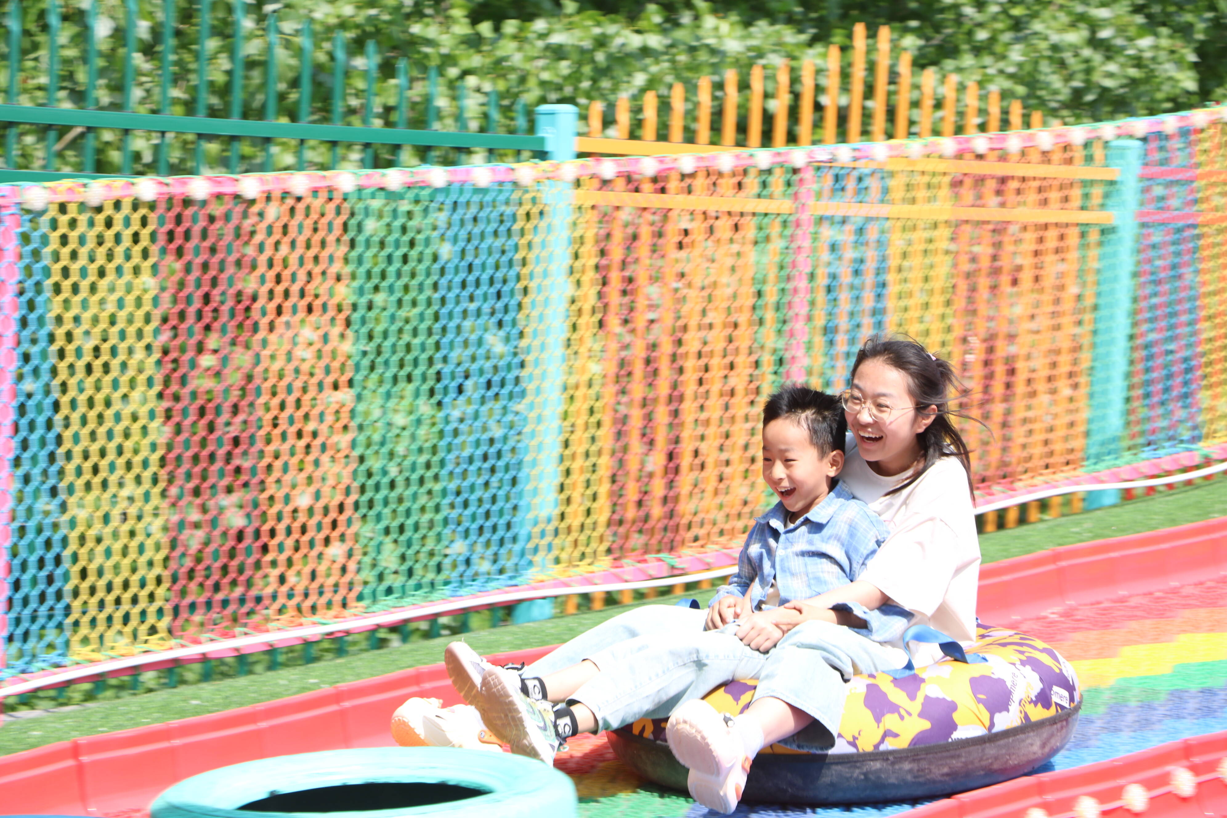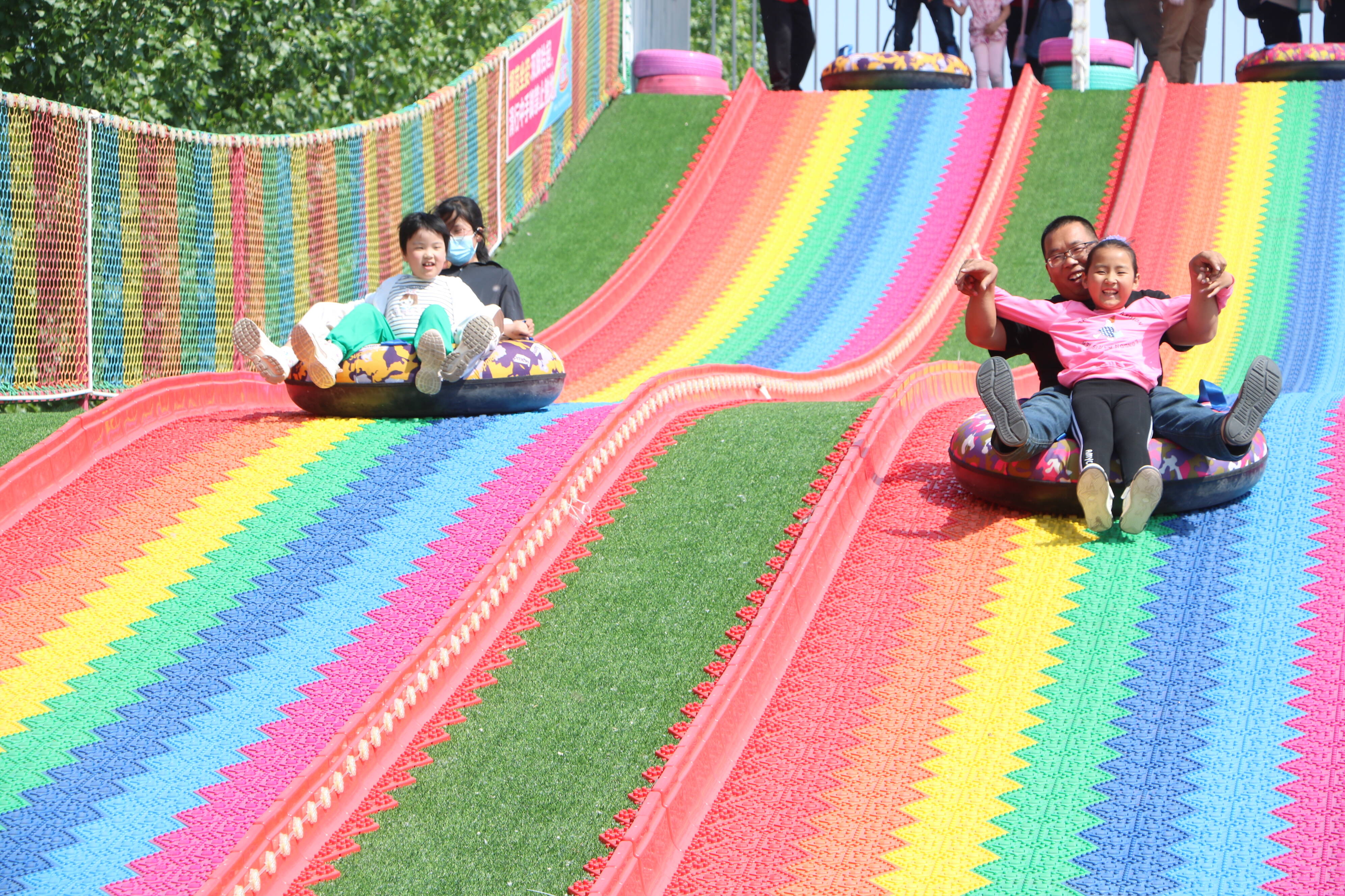 眼前,魔幻城堡高大矗立,孩子们爬上爬下、探头探脑,陶醉在神奇的空间中;一旁的彩虹滑梯,更是人声鼎沸,一个个轮胎成了大人和孩子的“坐骑”,一路疾驰而下宛若从云霄冲天而降。除了追求新奇与刺激的游乐设施,摇摇椅、小秋千、蹦蹦床等也是孩子们的最爱。徜徉其间,过山车不时从悬空轨道滑过,别具一番趣味。不远处,摩天轮耸入云端、海盗船不停摇摆,还依稀可见人们乘坐旋转木马、龙舟秋千、滑道溜索欢声笑语的身影。难舍家门口的欢乐世界,市民们索性坐在草坪上,撑起帐篷,觅一处阴凉,在悠闲的时光里,定格快乐、留住美好!