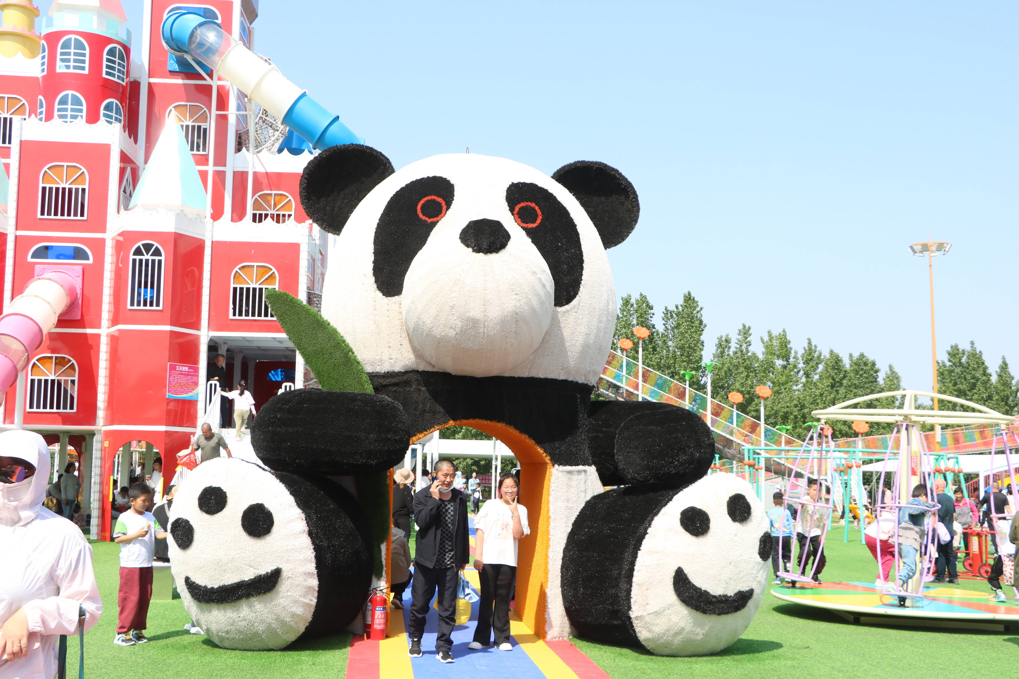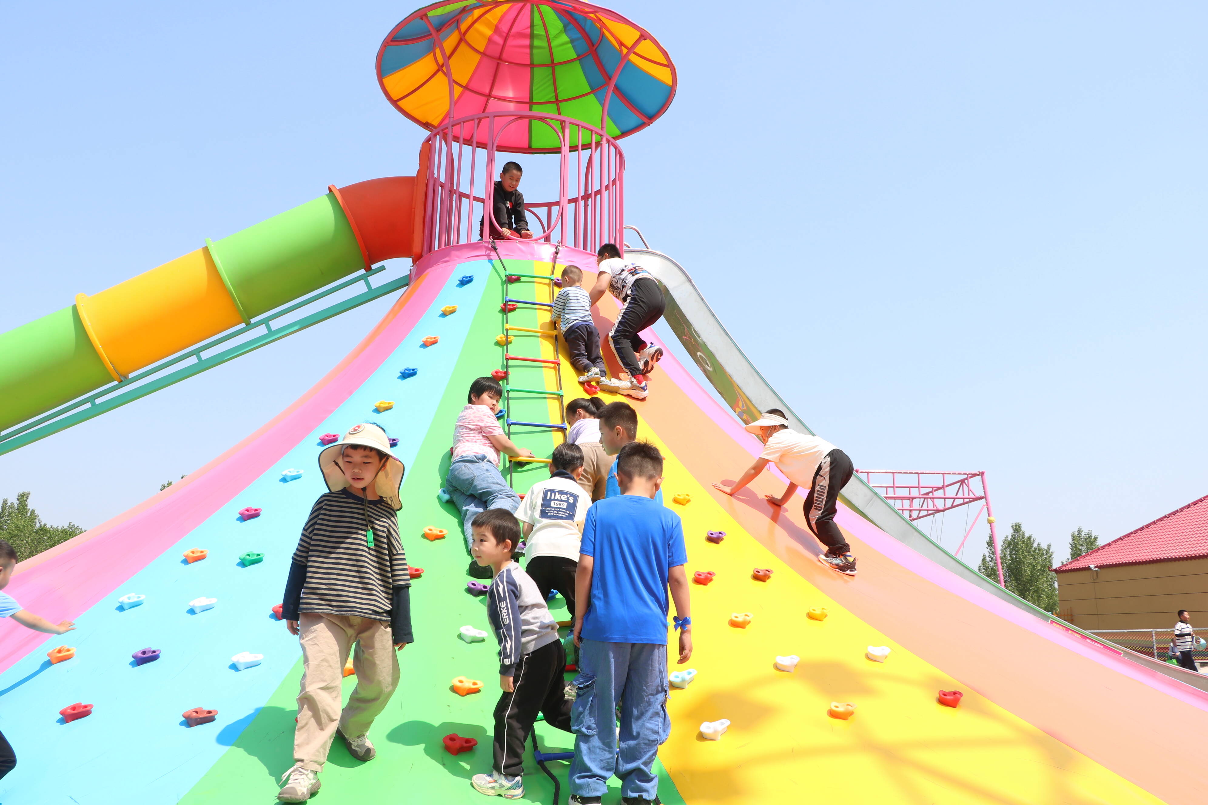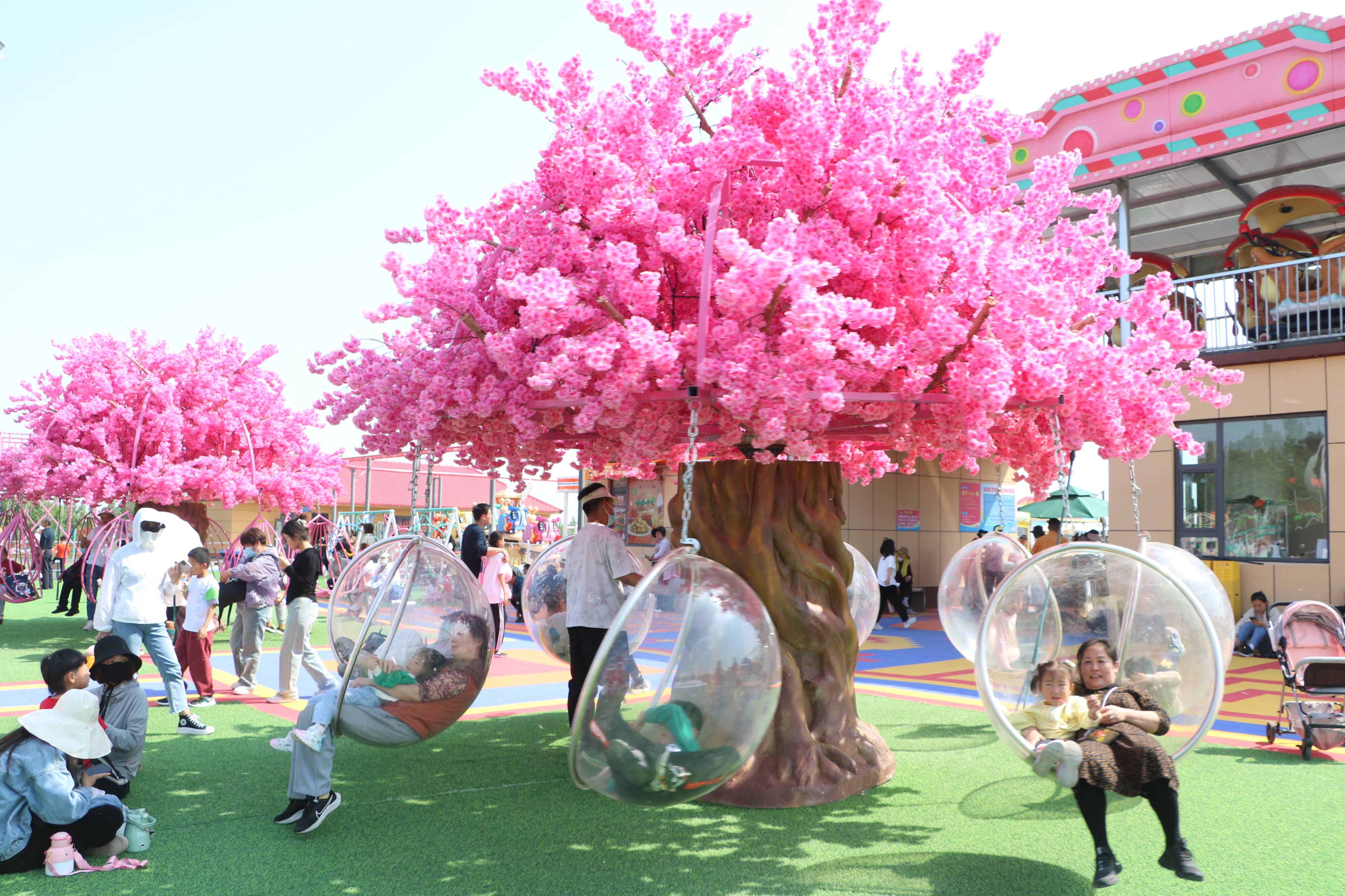 眼前,魔幻城堡高大矗立,孩子们爬上爬下、探头探脑,陶醉在神奇的空间中;一旁的彩虹滑梯,更是人声鼎沸,一个个轮胎成了大人和孩子的“坐骑”,一路疾驰而下宛若从云霄冲天而降。除了追求新奇与刺激的游乐设施,摇摇椅、小秋千、蹦蹦床等也是孩子们的最爱。徜徉其间,过山车不时从悬空轨道滑过,别具一番趣味。不远处,摩天轮耸入云端、海盗船不停摇摆,还依稀可见人们乘坐旋转木马、龙舟秋千、滑道溜索欢声笑语的身影。难舍家门口的欢乐世界,市民们索性坐在草坪上,撑起帐篷,觅一处阴凉,在悠闲的时光里,定格快乐、留住美好!