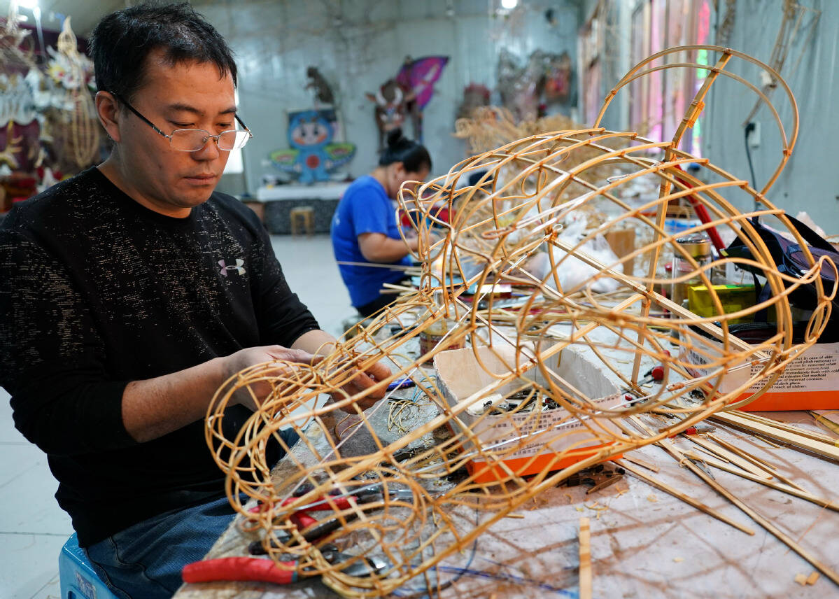 A worker makes the skeleton of a kite, at a kite workshop in Hanting district of Weifang, East China's Shandong province, Oct 14, 2024. [Photo/Xinhua]
