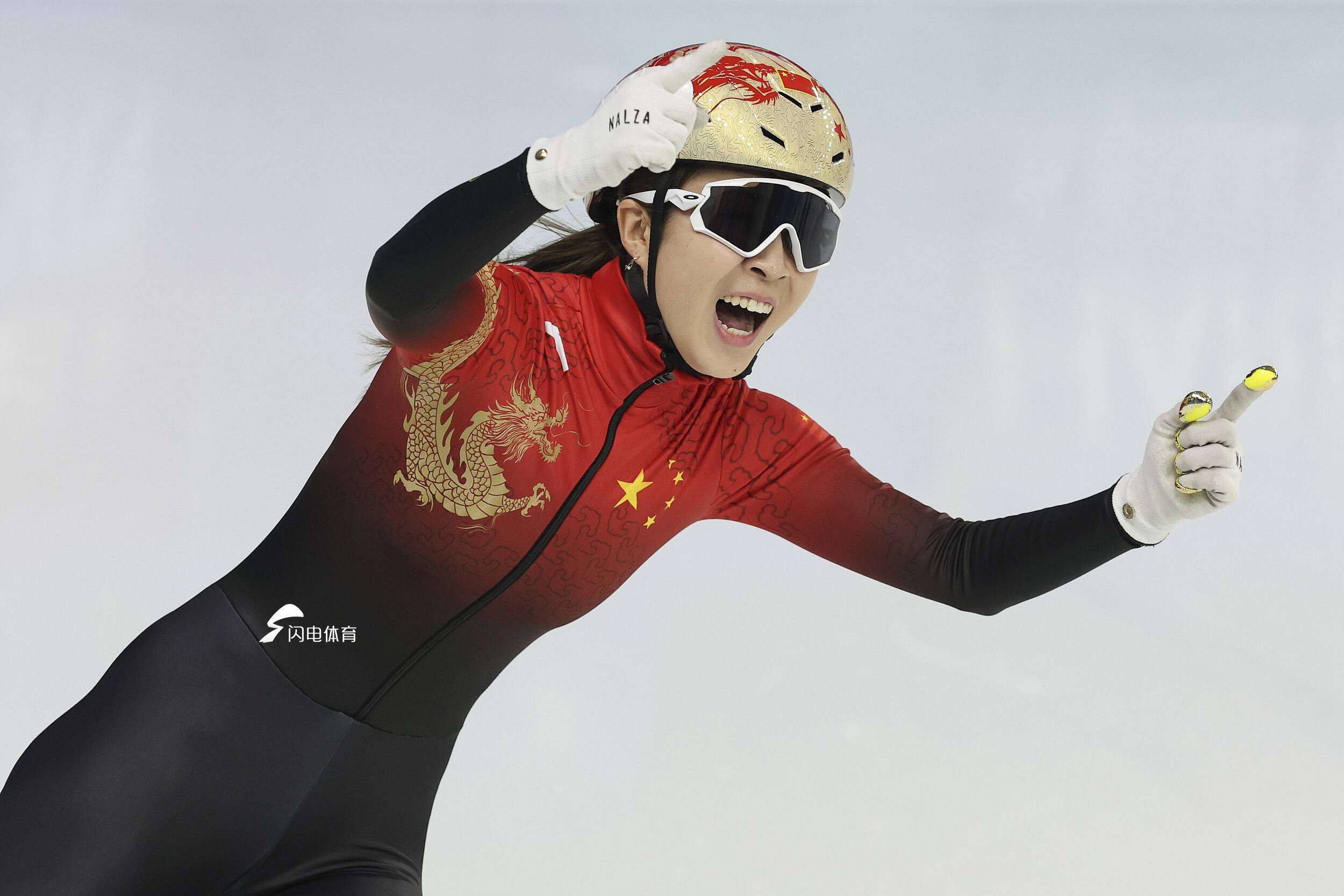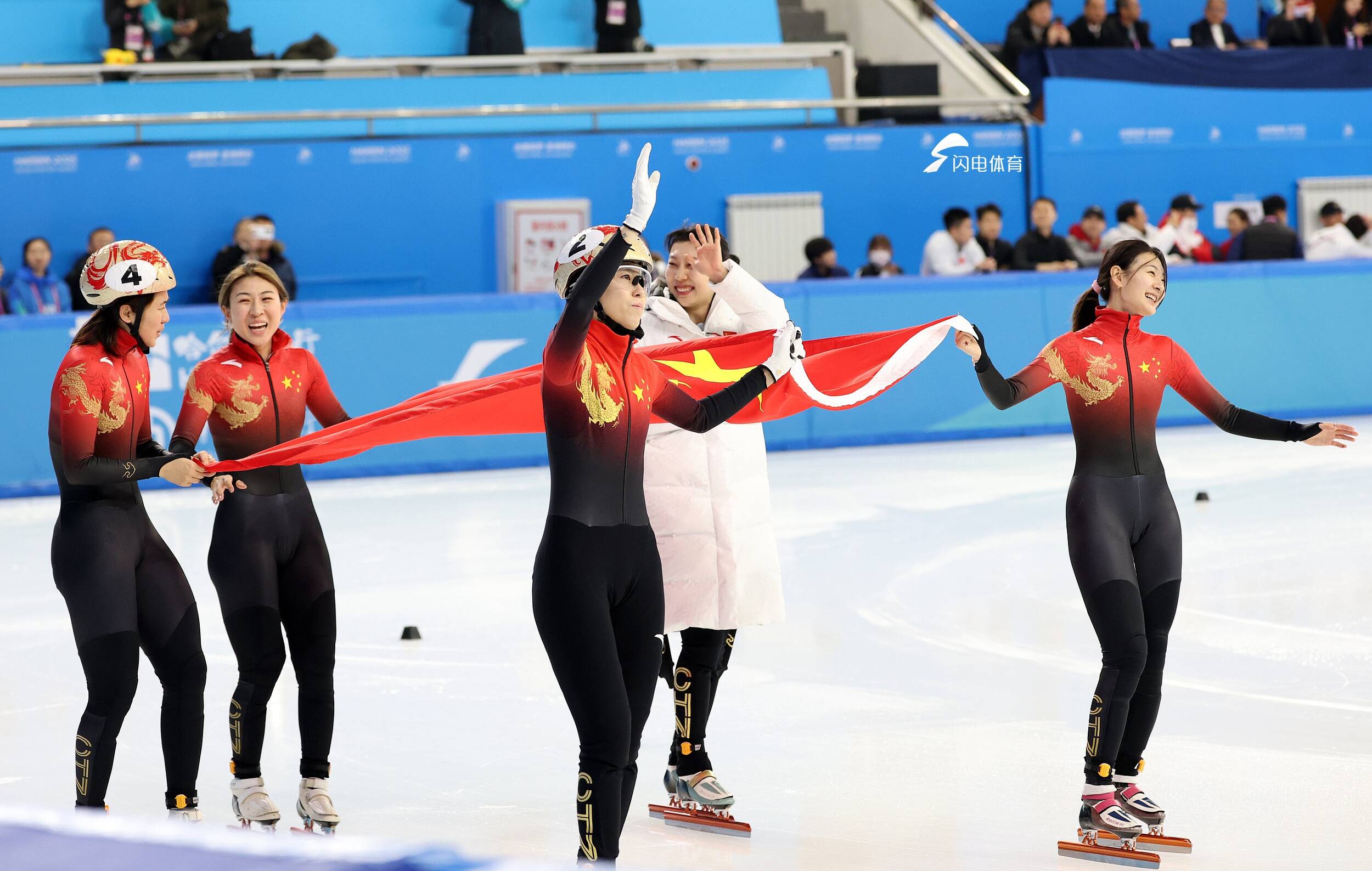 赛后,公俐与队友一同举起国旗,五星红旗飘扬在冰场上空。“当时就是非常坚决,心里想着能不能成功,就在那一下了。当时交接完之后,我们就变第二了,我就在找机会看看怎么去超越对手。”公俐回忆道。
