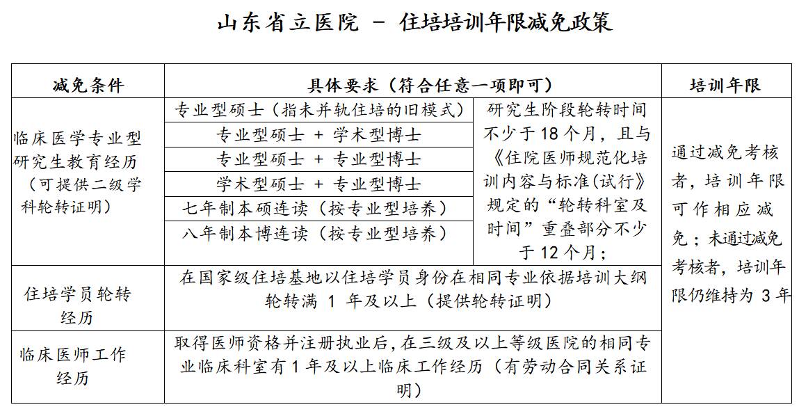 培训年限一般为3年。专业型硕士/博士研究生提供相关学历证明,或曾在其他国家住培基地轮转培训满1年且提供相应证明者,或符合以下减免条件者,可在入培报到后申请参加减免考核(含理论和技能考核),通过考核者可减免相应的培训年限。