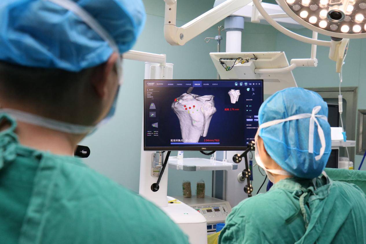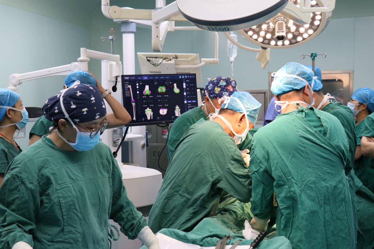 中午12:00左右,首台“极智EPS全膝关节手术机器人”辅助全膝关节置换手术顺利开台。患者为一名60多岁的重度膝关节炎患者,术前,医生团队利用患者CT数据,精准还原患侧下肢三维结构模型,进行详细的假体植入位置和角度规划,术中,机器人凭借其术前精准的测量数据和术中实时信息,给出精准的安全截骨范围。医生在可视影像导航下,通过操作机械臂,精准移动至截骨位置,完成截骨和假体安装,一气呵成,手术获得圆满成功。